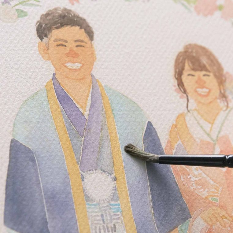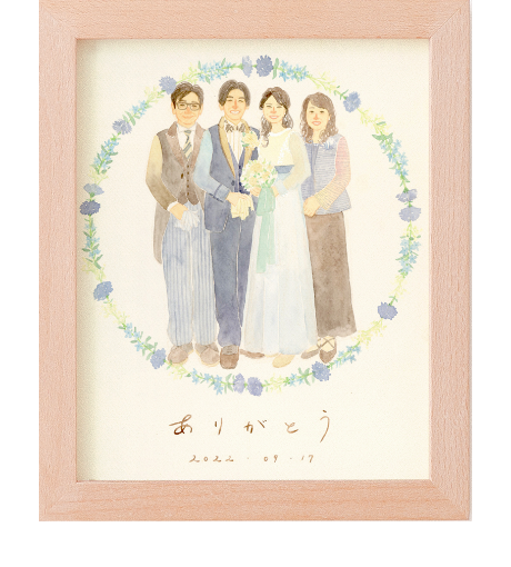 はちさんの絵は、ふわっとした柔らかい色合いと、水彩絵具の優しい雰囲気に惹かれてオーダーしました。想像以上に素晴らしい作品が届き、正直驚いています。この度はこのように素敵な作品を描いていただき本当にありがとうございました。