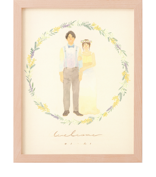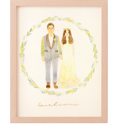 結婚式ではウェルカムスペースや受付・高砂。その後、ご自宅ではリビングや寝室・玄関など、似顔絵は様々な場所で飾られます。