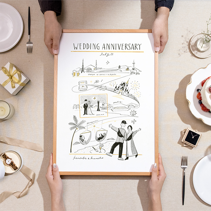 ふたりの出会いから現在までの忘れられないシーンの数々をまとめて1枚にすると、似顔絵をきっかけに、これまでの思い出を楽しく振り返れます。