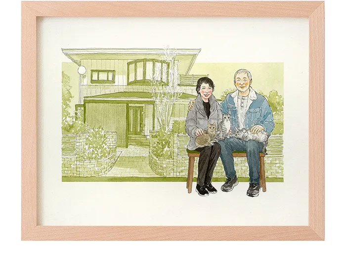 いつもの日常も、家族みんなと一緒なら特別な時間。背景も描くnokamiの似顔絵は、一緒に過ごした思い出や時間をいつもそばに感じられる一枚です。