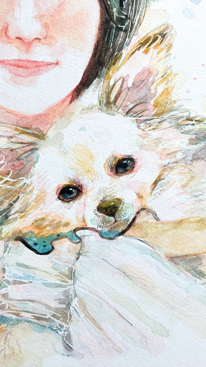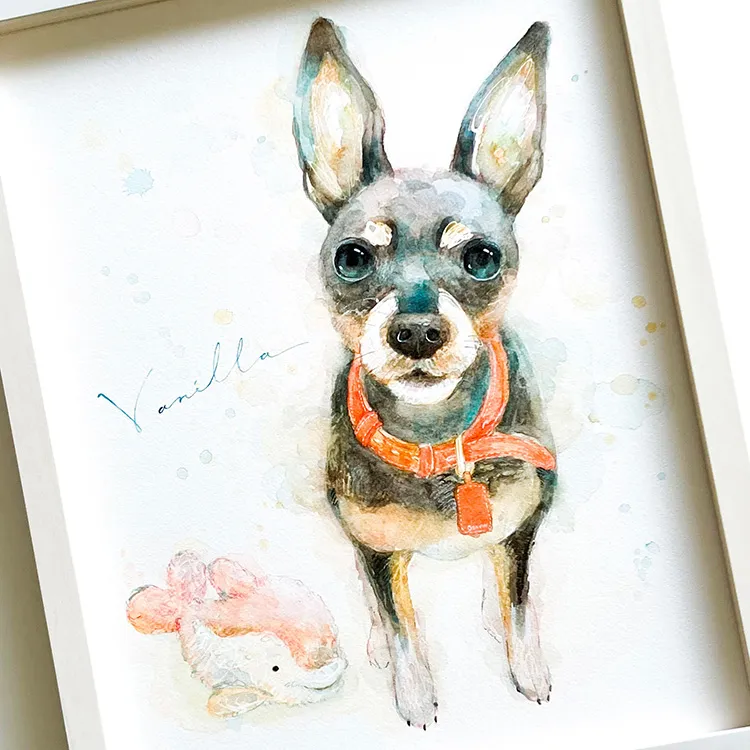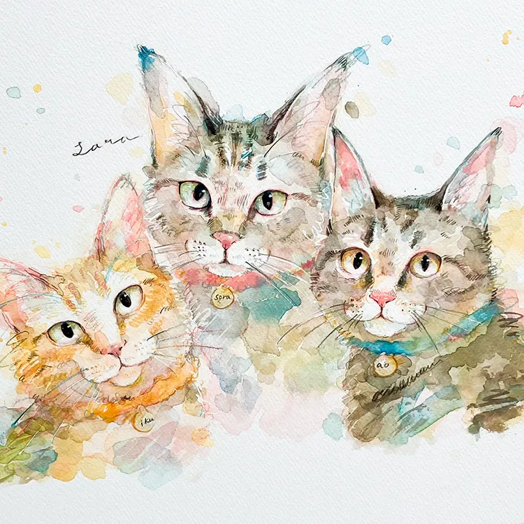水彩のやわらかな表現でその子らしい仕草や毛並みまで描きます。