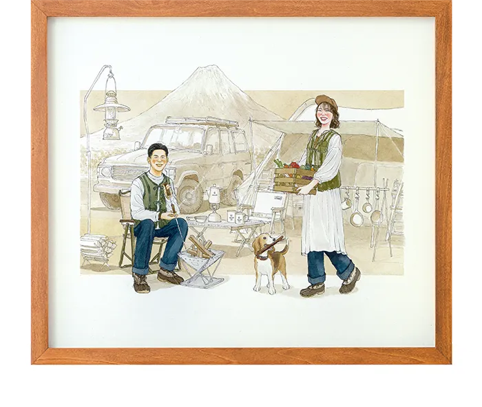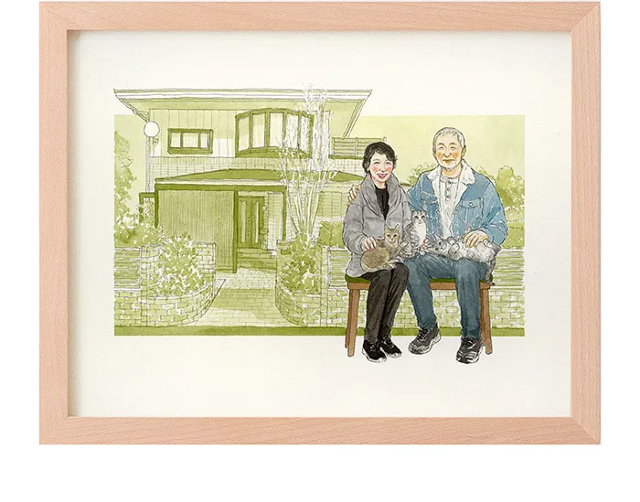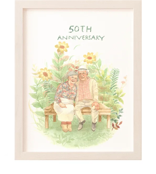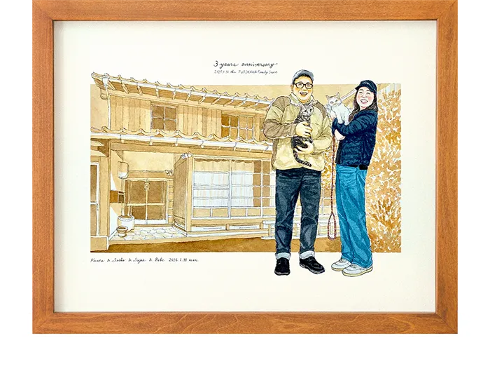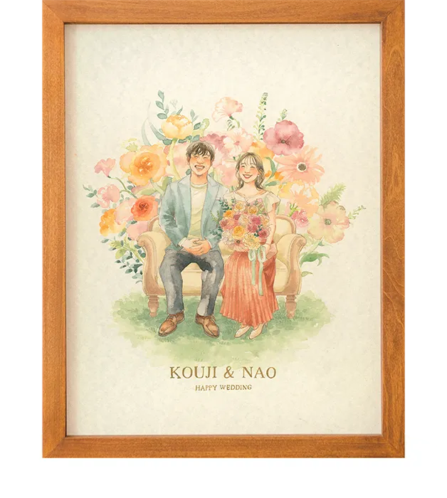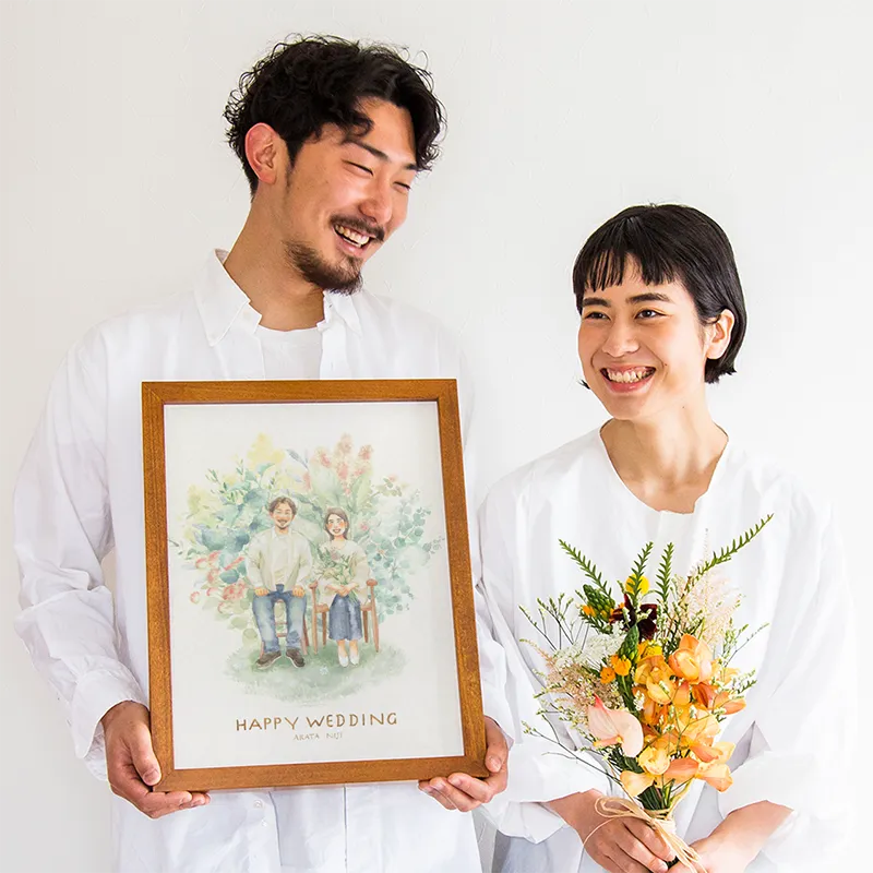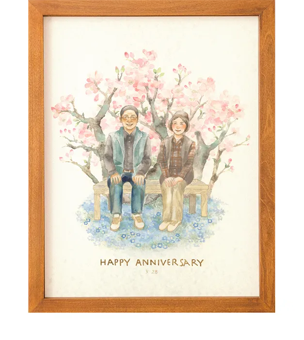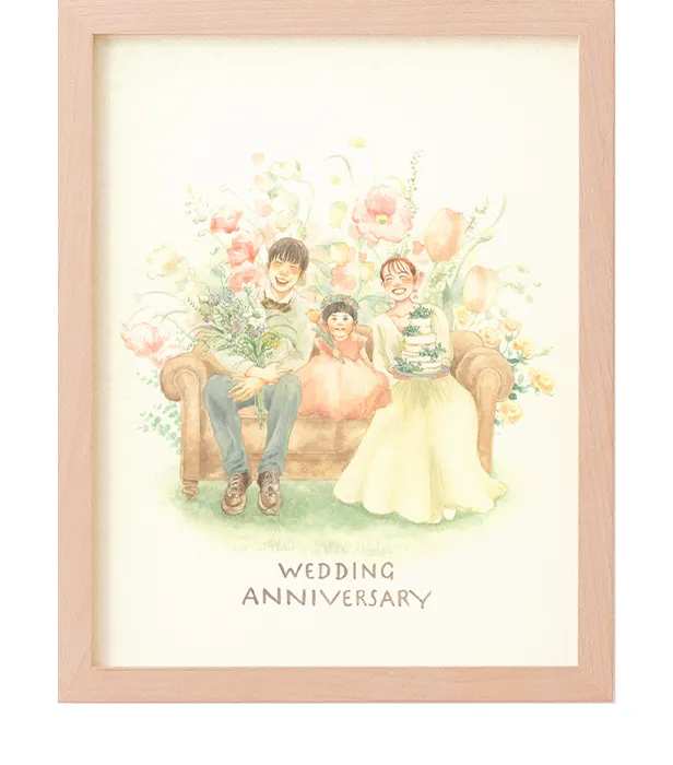 記念日に贈られた大切な花束を、二人の笑顔とともに一枚の絵に。