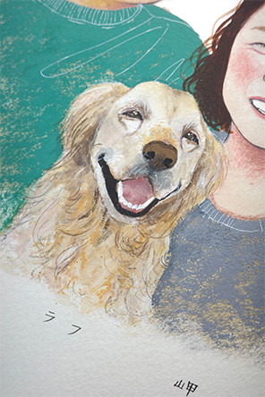 新築を背景に息子家族の笑顔いっぱいのそっくりな似顔絵にとても感動しました!