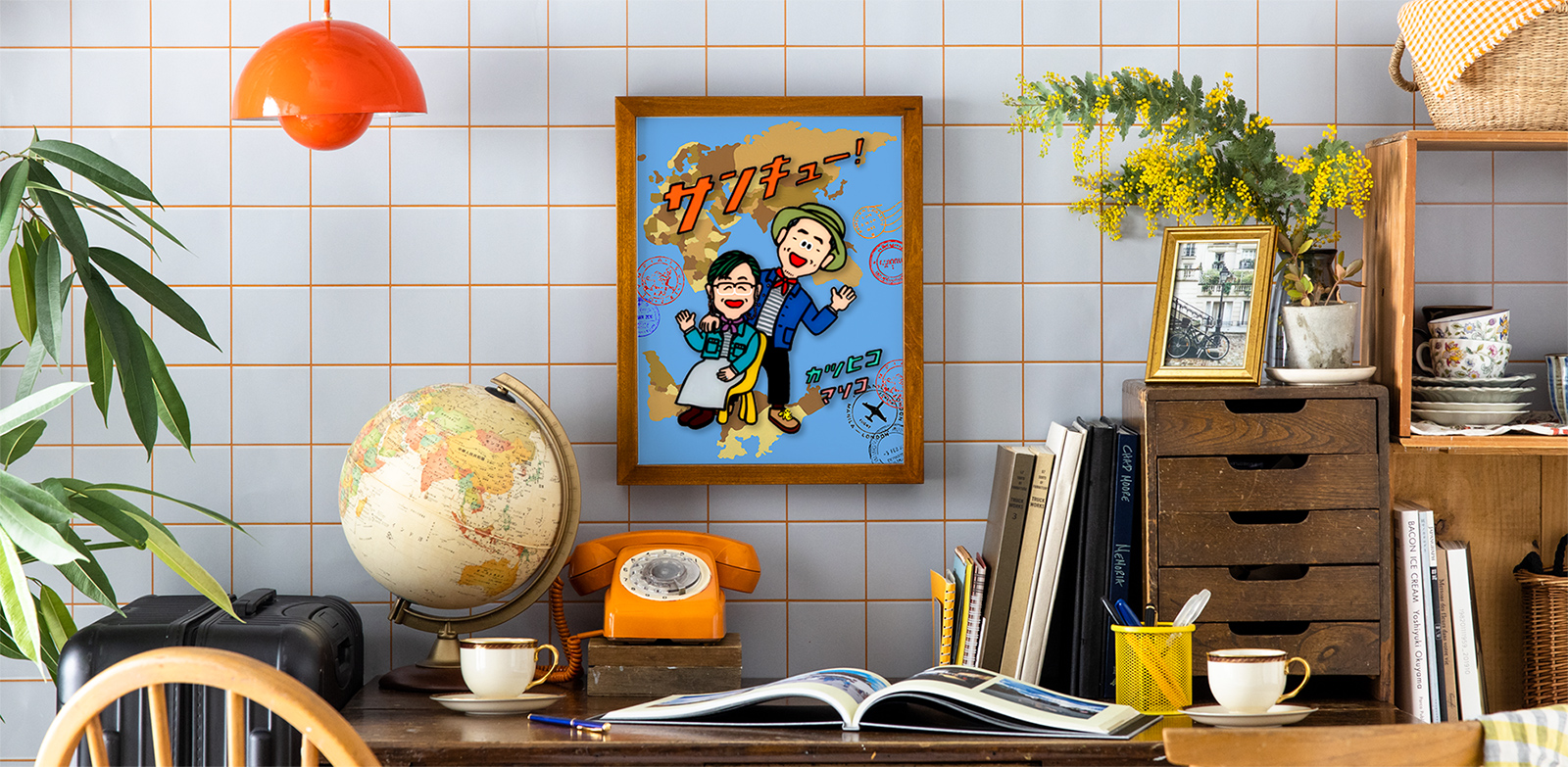 家族の思い出が詰まった実家、生まれ育った地元の風景。「nokamiの繋がる似顔絵」は、3枚の背景がひとつに繋がることで、離れていても家族の繋がりを感じられる作品です。